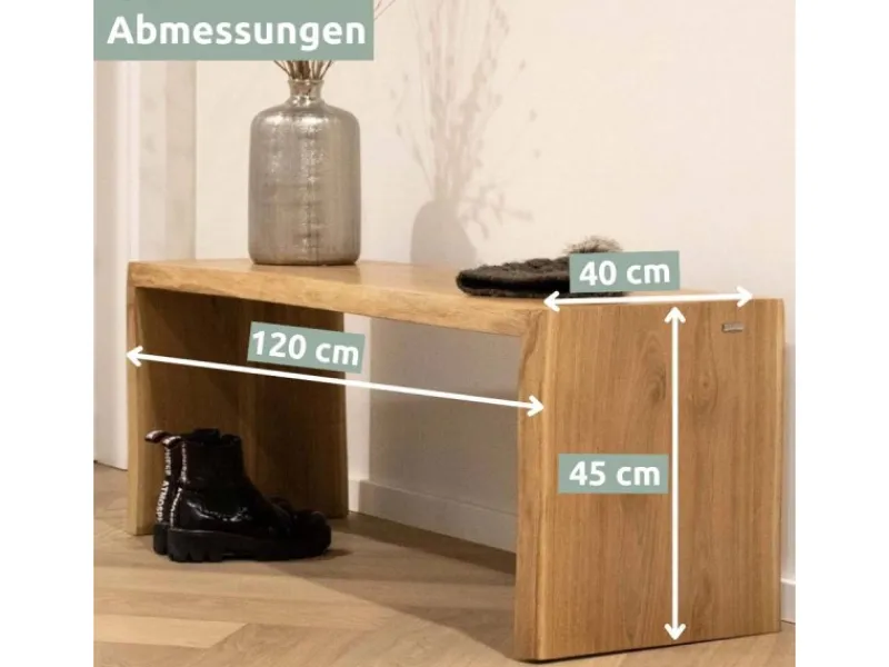 Die sorgfältig ausgewählten Materialien für die Holzbank garantieren ein zeitloses und elegantes Design. Dank der natürlichen Optik passt die Massivholz Holzbank perfekt in Räume aller Art. Die Sitzbank ohne Rückenlehne ist daher eine ideales Möbelstück für Dein Zuhause.