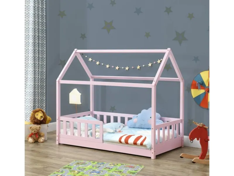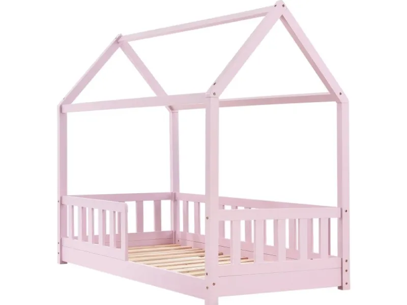 Kinderhausbett für kleine und große Abenteurer Das moderne Kinderbett Marli (80×160 cm, Rosa ) mit Rausfallschutz, Matratze, Lattenrost und Dach ist ideal für Mädchen und Jungen von 3 bis 10 Jahren. Als gemütlicher Schlafplatz und Spielort verschönert das Hausbett jedes Kinderzimmer. Denn die Hausoptik mit offenem Dach bietet viele Möglichkeiten! Gestalten Sie das Bett mit Himmeldekoration, als Höhle oder ein abenteuerliches Spielbett. Besonders für junge Kinder bietet ein Gitter mehr Schutz und Sicherheit. Für einen langjährigen Einsatz ist das Holzbett durch das massive und pflegeleichte Kiefernholz die richtige Wahl. Produktmerkmale Bett mit Matratze: