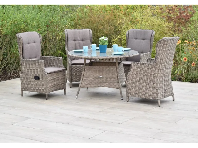 Das Set besteht aus insgesamt 4 Sesseln inkl. Auflagen die einen hohen Sitzkomfort bieten. Die Sessel verfügen über eine hohe Rückenlehne. Zwei der Sessel lassen sich stufenlos im Rücken durch eine Gasdruckfeder verstellen. Ergänzt wird das Set durch einen runden Tisch mit einer durchgeflochtenen Tischoberfläche und aufliegender Sicherheitsglasplatte. Der Tisch hat die Maße von Ø 120 cm.