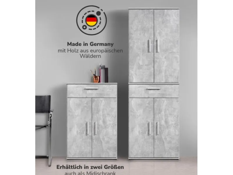 Das Produkt CLEVERER STAURAUM! Unser Schubladenschrank in 2 Größen vereint durch mehrere Fächer und Schubkasten Elemente aus Kommode & Nutzschrank miteinander, die dir viel Platz bieten. Individualisierbar mit weiteren Einlegeböden ‚Einleger‘ mit +4 Positionierungsmöglichkeiten. MADE IN GERMANY! Die Schränke werden aus Spanplatte mit beständiger Kunstharzbeschichtung & Kunststoffgriffen in NRW hergestellt. Durch die kompakten Maße dient der moderne Hoch- & Midischrank als Küchenschrank, Wäscheschrank, Büroschrank oder Allzweckschrank.