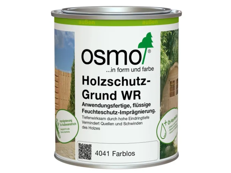 Osmo Holzschutz-Grund WR ist während des Anstrichs geruchsarm und nach der Trocknung geruchlos. Dieser Holzschutz ist kein Alleinanstrich. Um vollen Schutz (insbesondere vor UV-Strahlen) und eine dauerhafte Schönheit des Holzes zu gewährleisten, ist nach vollständiger Trocknung, spätestens jedoch innerhalb einer Woche, ein Endanstrich mit einem Osmo Außenanstrich erforderlich.
