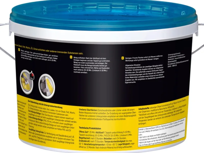 Anwendung: Es ist darauf zu achten, dass der Untergrund sauber, rissfrei, fest, trocken, tragfähig und trennmittelfrei ist. Der Belag wird großflächig ausgelegt und zur Hälfte zurückgeschlagen. Der Dispersionskleber ist gebrauchsfertig und kann nach sorgfältigem Umrühren einfach mit Rolle oder Zahnspachtel aufgetragen werden. Nach ca. 10-15 Minuten Ablüftungszeit kann der Belag ohne Lufteinschlüsse in das noch nasse Klebstoffbett eingelegt und gut angerieben werden.