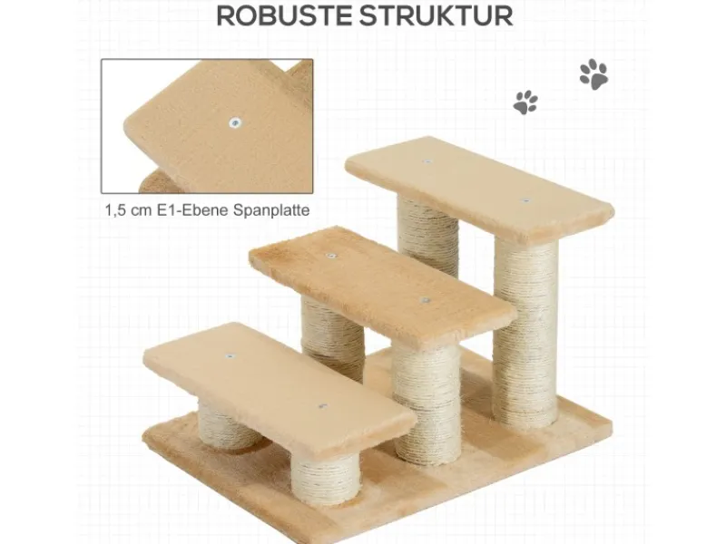 Diese lustige und hilfreiche Treppe von PawHut macht es kleinen oder alternden Haustieren leicht, sicher an eine höhere Stelle zu klettern. Der Rahmen besteht aus massiven Spanplatten, jede Stufe ist mit einem weichen Plüschbezug ummantelt und bietet eine sanfte Oberfläche, die weich für die Pfoten ist, um Schmerzen beim Klettern zu reduzieren. Kratzbäume mit Sisalseilen helfen, die Krallen der Katze zu schärfen und schützen gleichzeitig Ihre Möbel.