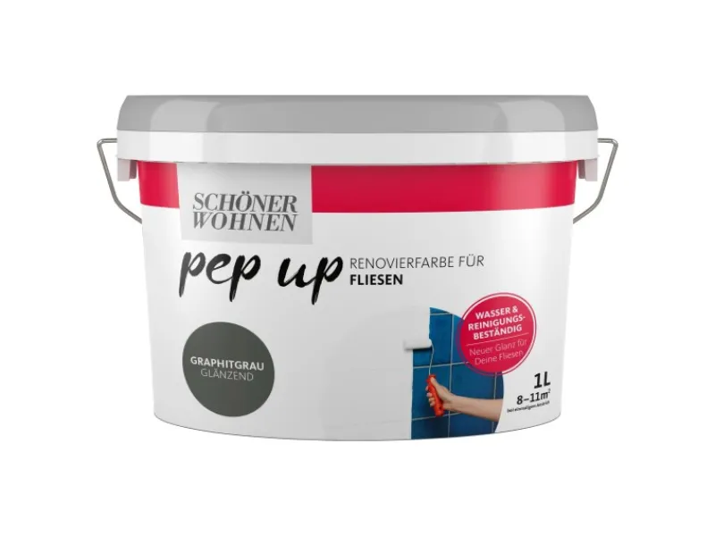 Mit den trendbewussten Schöner Wohnen pep up Renovierfarben für den Innenbereich entsteht schnell und einfach ein frischer Look für die eigenen vier Wände. Die Renovierfarbe für Fliesen ist wasserbasiert, lässt sich leicht verarbeiten, ist besonders wasserbeständig und eignet sich für Wandfliesen im Trocken- und Nassbereich.
