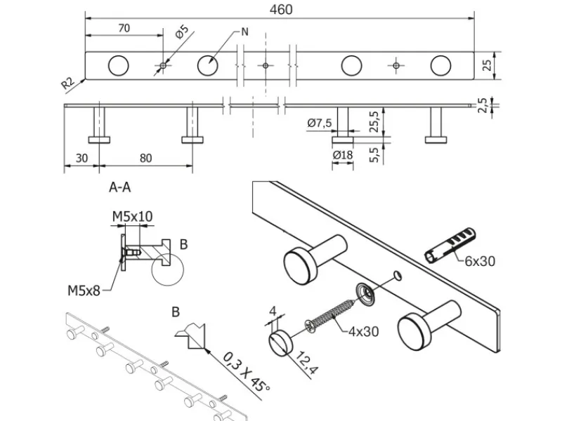 Abmessungen – Gesamtlänge 300 mm / Höhe 25 mm / Tiefe 38 mm / Haken-Ø 12 mm