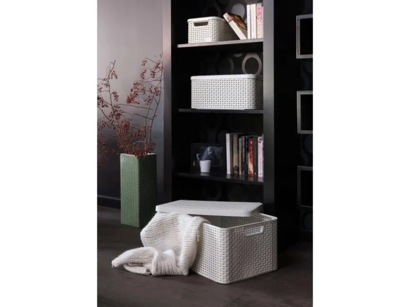 Das universell einsetzbare Aufbewahrungsboxen Curver Style 3-er Set Creme S + M + L mit Deckel lässt sich in seiner angesagten Rattan-Struktur hervorragend in Ihr Ambiente integrieren. Die Box in der Größe S besitzt die Maße 14,2 cm x 29,1 cm x 19,8 cm und hat ein Fassungsvermögen von 7 l, M umfasst eine Größe von 18,7 cm x 39, 7 cm x 29 cm und insgesamt 18 l, Größe L besteht aus 24,8 cm x 44,5 cm x 33,3 cm und fasst 30 l. Sie verleihen Ihrer Dekoration mit dem unifarbenen Rattan-Design eine einzigartige und erstklassige Haptik. Die kleinen Ablageboxen können auf Regalen, Tischen, in Schubladen und vielem mehr eingeordnet werden.