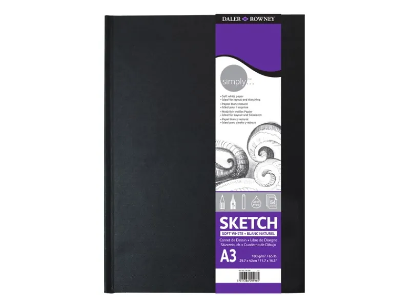 Daler-Rowney Simply Hardbound Skizzenbücher eignen sich für den Innenbereich, für unterwegs oder für Künstler, die ihre Zeichnungs-, Skizzier- und Maltechniken üben wollen. Daler-Rowney Simply Sketchbooks besteht aus einer kompakten Reihe von alltäglichen Skizzenbüchern. Diese 100 g/m² weichen, weißen Skizzenbücher mit mittlerer Körnung sind ideal für Anfänger und Hobbykünstler. Dieses A3 Portrait-Skizzenbuch enthält 54 Blatt weiches, weißes 100gsm Papier.