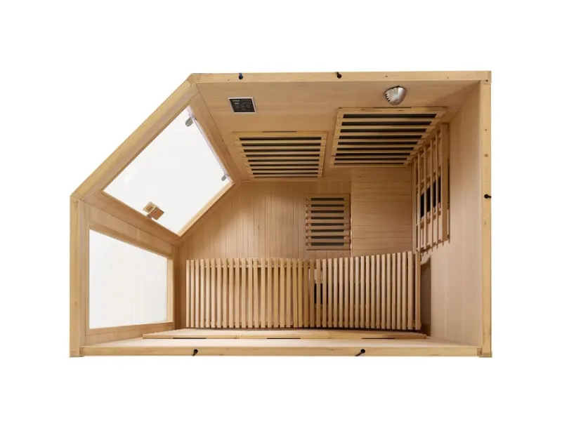 Hemlockholz speichert die Infrarotwärme optimal und sorgt für ein wohltuendes Raumklima. Es ist wasserabweisend und langlebig.