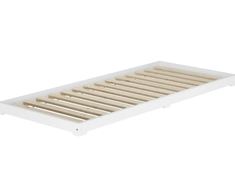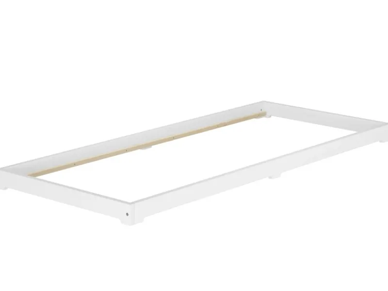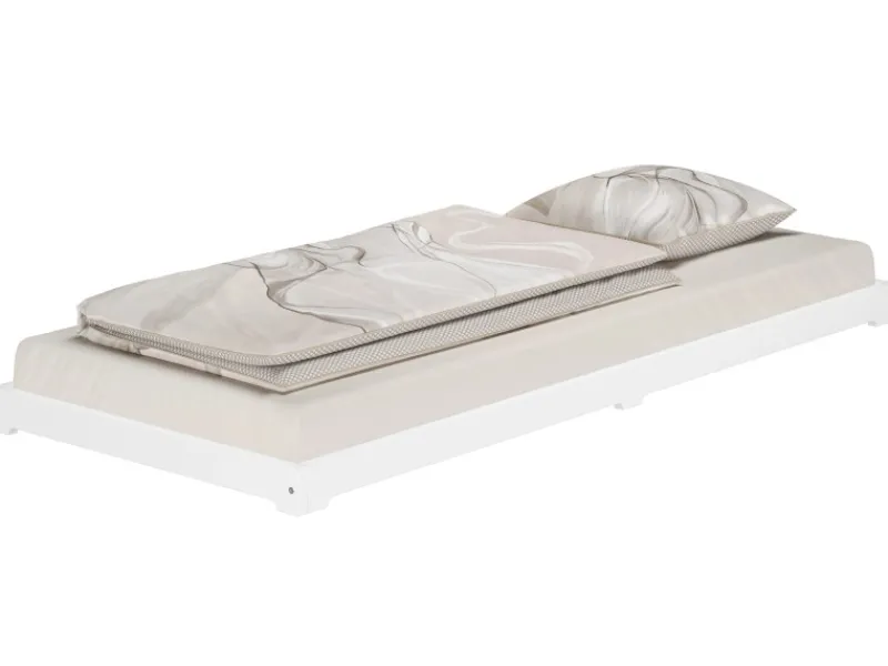Extra niedriges, weißes Futonbett aus massiver KieferLiegefläche: kompakte 80×190 cmNatürliches MaterialNaturprodukt Holz … logisch!BeschreibungUnser weißes Massivholz-Niedrigflurbett ist besonders gut geeignet für kleine Kinder mit unruhigem Schlaf. Der Bettrahmen ist nur 9 cm hoch so wird die Verletzungsgefahr beim Rausrollen deutlich minimiert.Auch das Aufstehen und Zubettgehen wird erleichtert, was gerade für Kinder ein echter Vorteil ist.Doch nicht nur Kinder profitieren: Auch als schmales Notbett lässt sich das Modell hervorragend unter größeren Betten oder hinter Türen verstauen.Bei Bedarf einfach auf den Boden legen schon ist man bestens für spontane Übernachtungsgäste gerüstet.Der Rahmen besteht aus massiver Kiefer, fein geschliffen und waschweiß lackiert. Kiefernholz besitzt eine lebendige Maserung. Die weiße Lackierung ist sehr deckend jedoch kann es mit der Zeit vorkommen, dass dunklere Astbereiche leicht durchscheinen.Die Auflageleisten an den Seitenteilen sind für einen Rollrost gedacht (nicht im Lieferumfang enthalten). Der Aufbau ist unkompliziert ein passender Schraubensatz ist enthalten.Dank der freiliegenden Matratze ist die Belüftung optimal, was das Schlafklima verbessert. Die Matratze liegt auf dem Rahmen, nicht in ihm da die Seitenteile bewusst niedrig gehalten sind.Massivholzmöbel sind stets Unikate jede Maserung ist einzigartig und macht den natürlichen Charakter dieses Betts aus.Maße im ÜberblickAußenmaß: ca. 85 x 195 cmRahmenhöhe: nur ca. 9 cmStärke der Seitenwände: ca. 2,4 cmEinlegetiefe für Rollrost und Matratze: ca. 5,5 cmHolzteile verbunden mit Dübeln und Schrauben