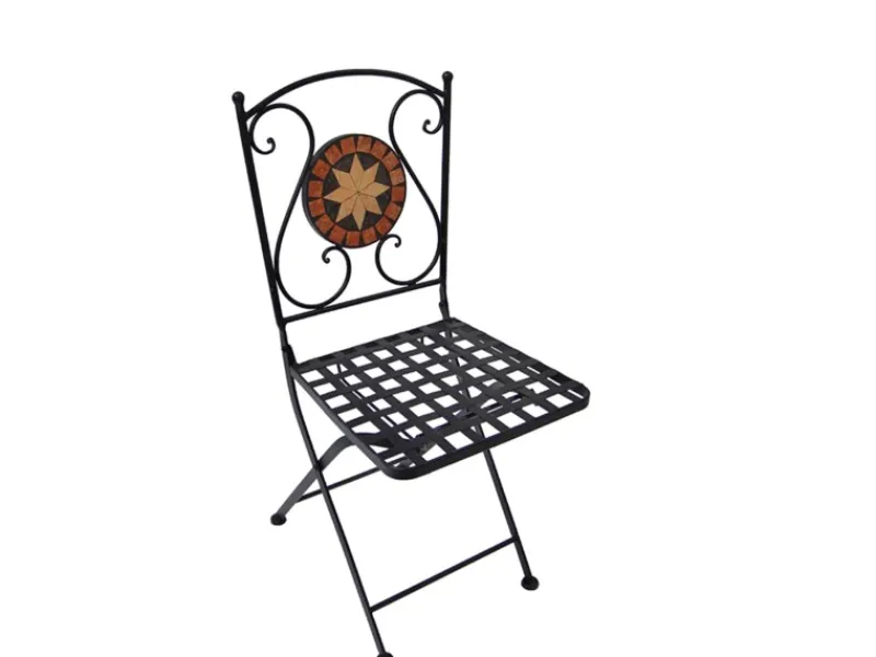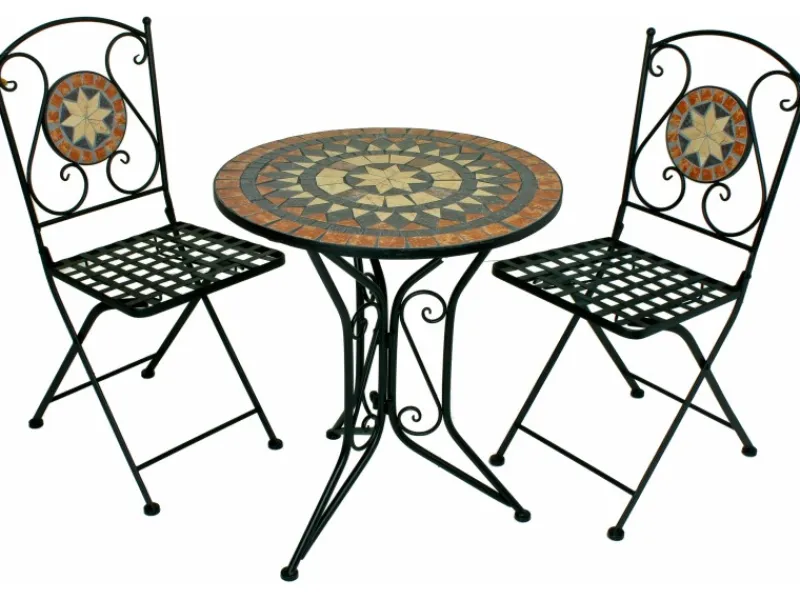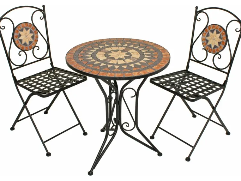 Das Highlight dieses Sets ist die Tischplatte und die Rückenfläche der Stühle, die mit einem wunderschönen Keramikmosaik gestaltet sind. Die warmen Erdtöne und das kunstvolle Muster verleihen dem Set eine natürliche und harmonische Ausstrahlung. Die keramischen Elemente sind nicht nur robust und wetterbeständig, sondern auch leicht zu reinigen, sodass Sie sie einfach mit einem feuchten Tuch sauber halten können.