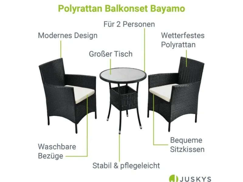 Die 3-teilige Sitzgruppe bestehend aus einem stabilem Tisch und 2 Loungesesseln eignet sich perfekt als platzsparendes Balkonset für 2 Personen. Werten Sie mit den modernen Gartenmöbeln Ihren heimischen Balkon auf und schaffen sich eine eigene kleine Wohlfühloase für unvergessliche Sommermomente.