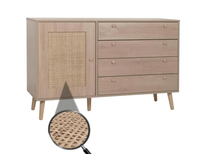 Entdecken Sie das Sideboard der Extraklasse! Handgefertigtes natürliches Kubu Rattan verleiht der Türe dieses Möbelstücks eine unvergleichliche Schönheit und Authentizität. Mit seinen vier Schubladen und einem großzügigen Ablagefach bietet dieses Sideboard reichlich Platz, um Ihre Habseligkeiten ordentlich zu verstauen und gleichzeitig stilvoll zu präsentieren. Die stabilen Füße aus Massivholz sorgen für eine zuverlässige Standfestigkeit und unterstreichen die hochwertige Verarbeitung dieses Möbelstücks. Die Oberfläche ist mit einer robusten Melamin-Beschichtung versehen, die nicht nur besonders kratzfest ist, sondern auch wasserfest, damit Sie sich keine Sorgen um Flecken oder Beschädigungen machen müssen.