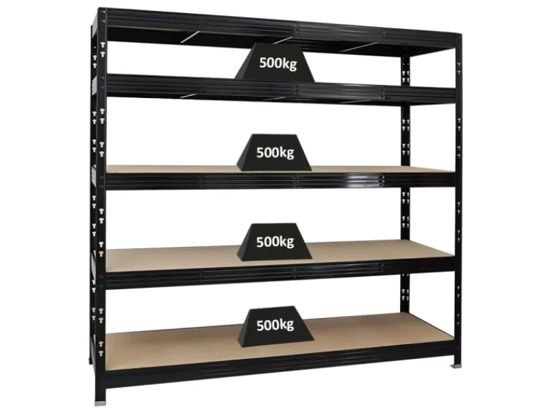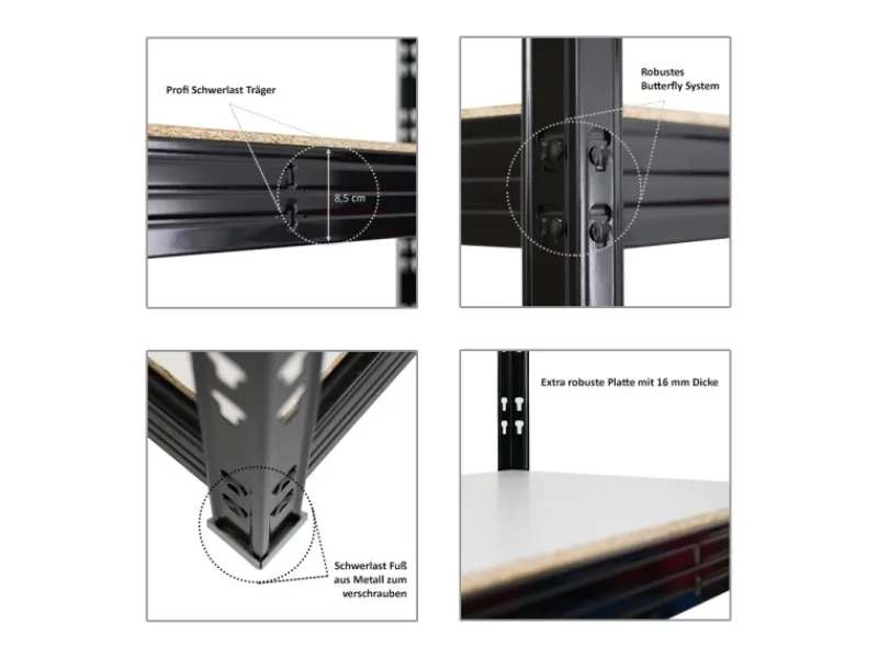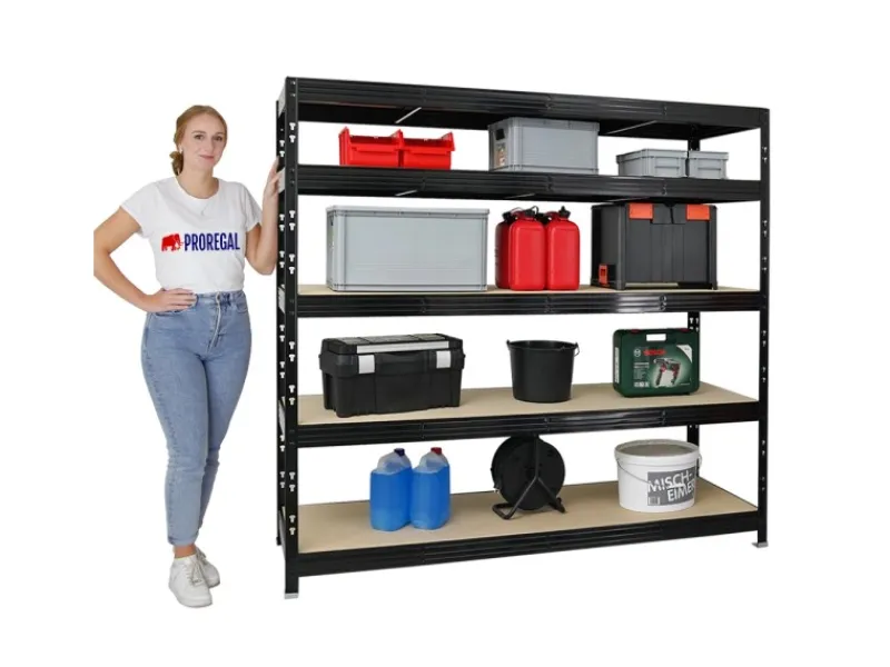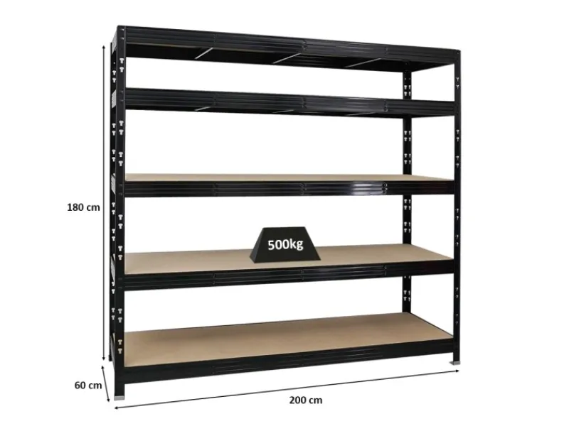 Das Schwerlastregal ist 180 cm hoch, 200 cm breit und 60 cm tief. Die Farbe ist Schwarz