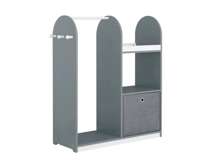 Mit Stoffbox, Haken und Fächern eignet sich der Schrank ideal zur organisierten Aufbewahrung.