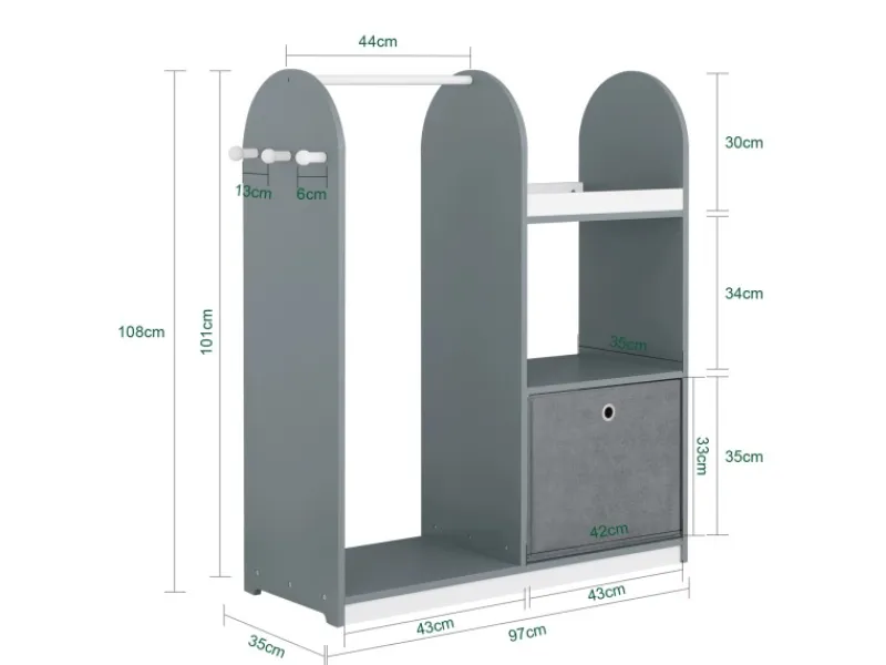 Die Kleiderstange auf 108 cm Höhe ermöglicht Kindern eigenständiges Aufhängen der Kleidung.