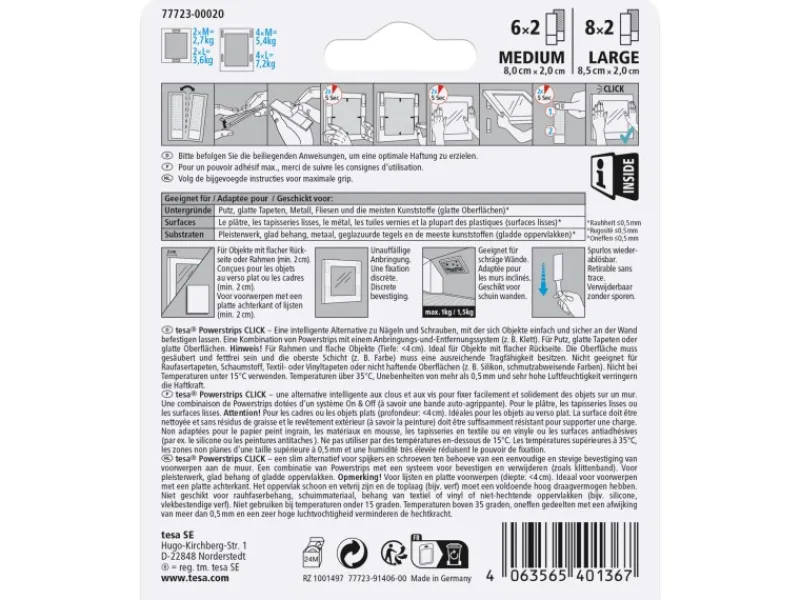 Mit den Powerstrips Click wird das flexible Dekorieren in den eigenen vier Wänden erleichtert – das Ambiente im Raum lässt sich mit einfach wechselbaren Wanddekorationen nach Lust und Laune verändern. Darüber hinaus ist der gebotene Halt sicherer als bei herkömmlichen Nägeln. So hängen beispielsweise Bilderrahmen nicht nur an einem einzelnen Nagel, sondern sind mit einem Streifen pro Ecke befestigt. Einmal fixiert, wird so das Verrutschen und Verwackeln verhindert.