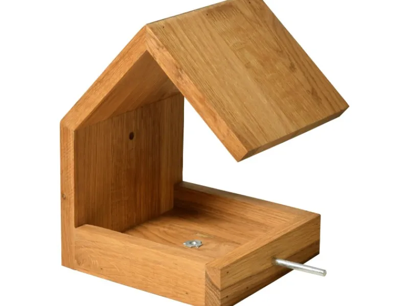 Das Design-Vogelhaus in modernem Design ist aus EU-Eichenholz gefertigt. Es verfügt über ein Satteldach und eine Anflugstange aus Metall. Zum Befestigen an Baum oder Wand.
