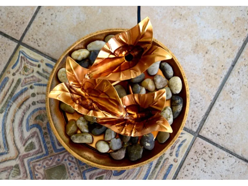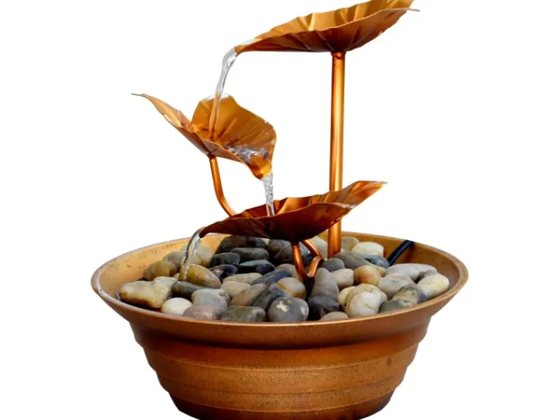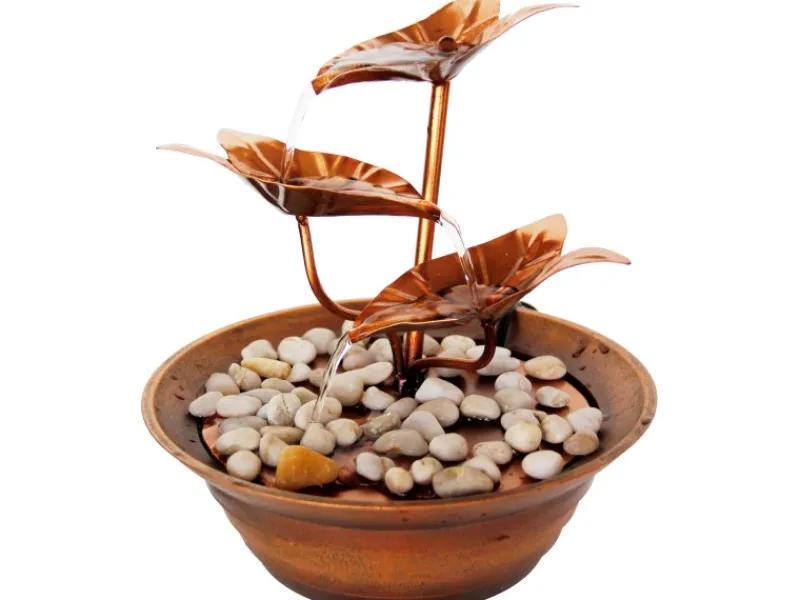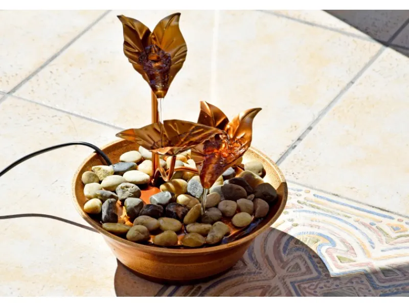 Das beeindruckende Wasserspiel verfügt über einen geschlossenen Wasserkreislauf mit einer geräuscharmen Wasser-Pumpe. Der Springbrunnen wird mit einem Netzstecker betrieben inkl. 1,5 m Kabel. Er besteht aus Metall (Blätter-Design) und festem Kunststoff (Unterbau).