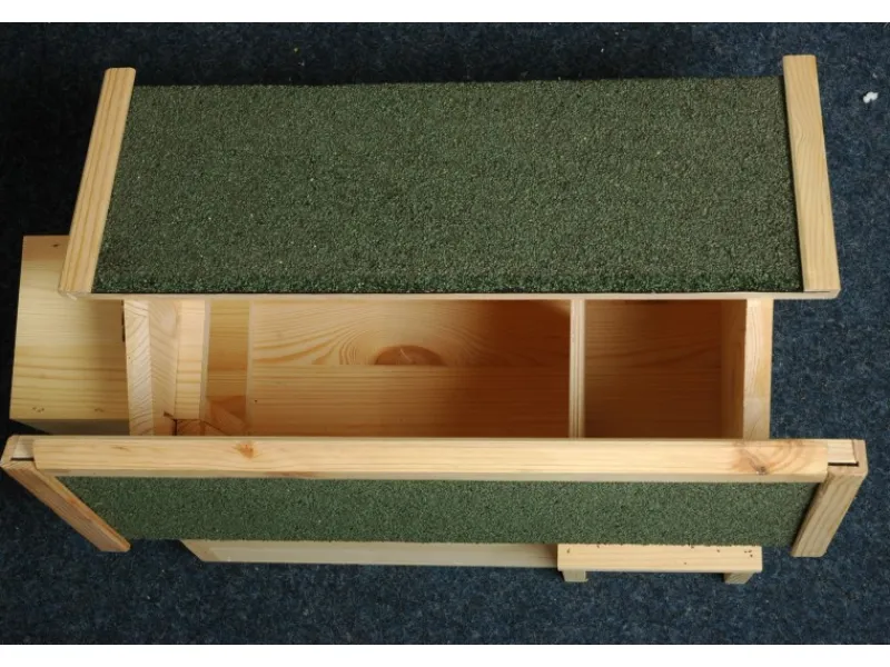Das mit Bitumen gedeckte Dach kann zum Füttern hochgeklappt werden.