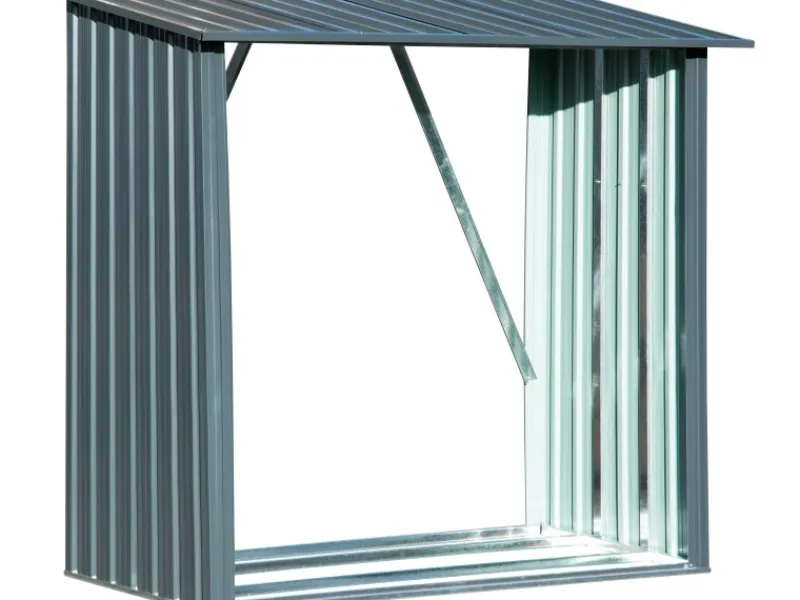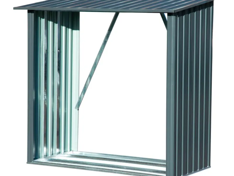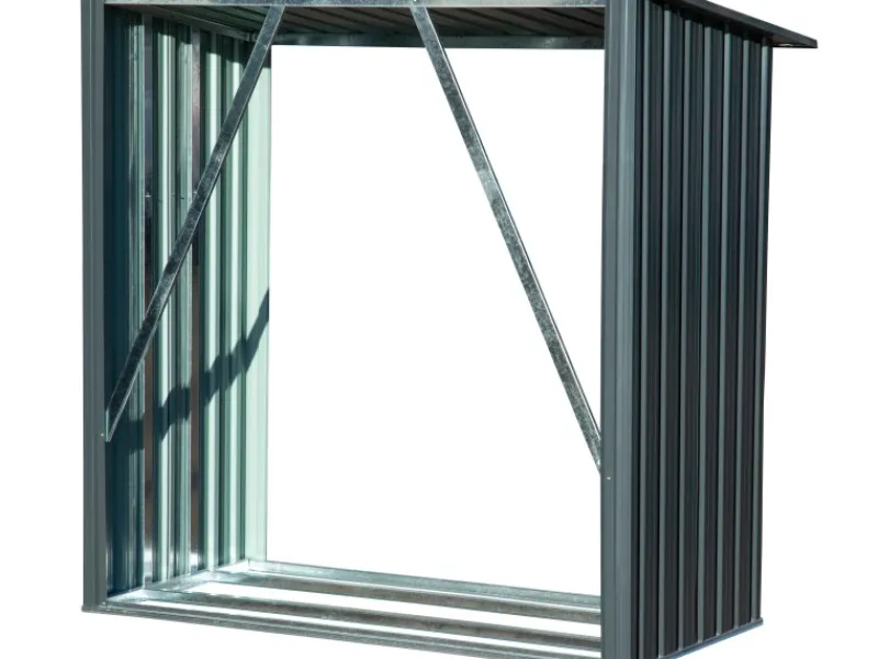 Das Holzlager besteht aus verzinktem Metallblech, Stärke: 0,25 mm (Flächen) bzw. 0,6 mm (Rahmen)