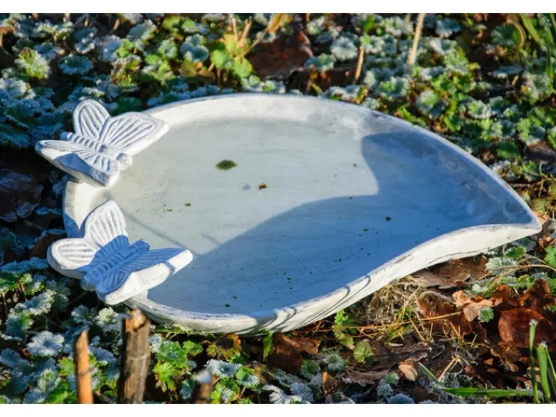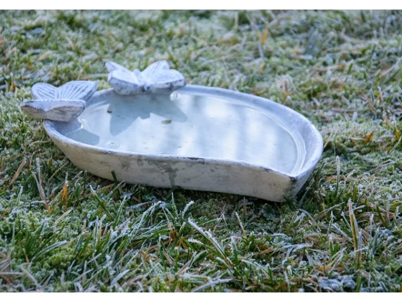 Ein regelmäßiger Austausch des Wassers sowie die Reinigung der Schale sind zu empfehlen, um Krankheiten vorzubeugen. Auch wenn keine Badegäste in Sicht sind, ist die Vogeltränke ein schöner Anblick. So macht das antik anmutende Äußere die Wasserstelle zu einem dekorativen Gestaltungselement für den Garten und zwei Deko-Schmetterlinge auf dem Rand der Wasserschale setzen einen weiteren auffälligen optischen Akzent.