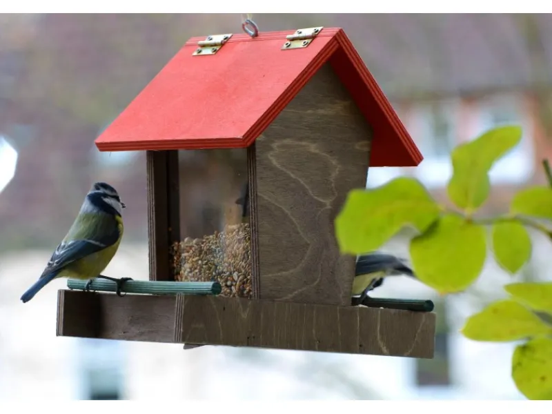 Das Vogelfutter im Inneren wird durch Acrylglasscheiben vor Regen und Verschmutzung geschützt