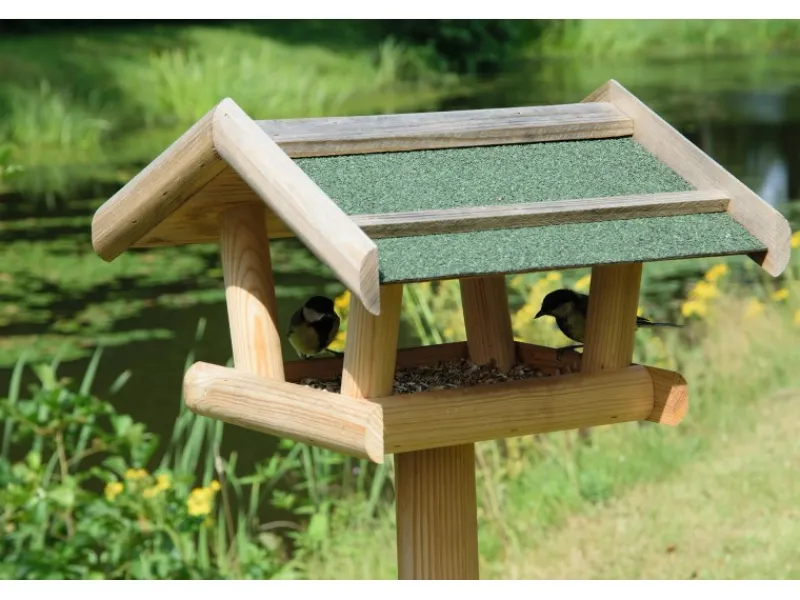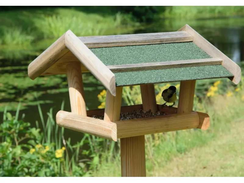 Großer Dachüberstand schützt das Vogelfutter vor Regen und Schnee