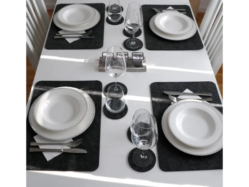 Natürlich auch auf einer Glasplatte oder einem Holztisch: Die dicken Filz Platzdecken veredeln jeden Esstisch. Sie sind 5 mm dick, beidseitig verwendbar und absolut unempfindlich – perfekter Schutz vor Flecken, Macken und Kratzern.