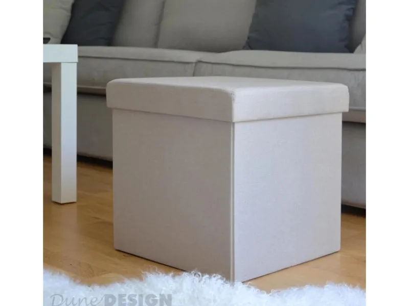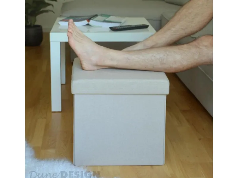 Die kompakte Sitztruhe von DuneDesign besticht nicht nur durch ihre moderne, edle Optik, die zu jedem Einrichtungsstil passt, sondern auch durch ihre Funktionalität. Der faltbare Hocker kann als bequeme Sitzgelegenheit, Fußablage, als kleiner Beistell- oder Nachtisch und natürlich als stauraumreiche Aufbewahrungskiste für z.B. Bücher, Zeitschriften, Tagesdecken, Dekokissen, Kleidung, Schuhe, Strickzeug, Spielzeug, etc. verwendet werden.
