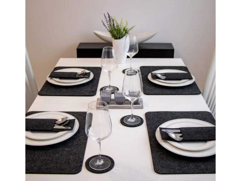Besonders fein auf einem weißen Tisch – natürlich auch auf einer Glasplatte oder einem Holztisch. Das dicke Filzset ist beidseitig verwendbar und absolut unempfindlich: Perfekter Schutz vor Flecken, Macken und Kratzern.