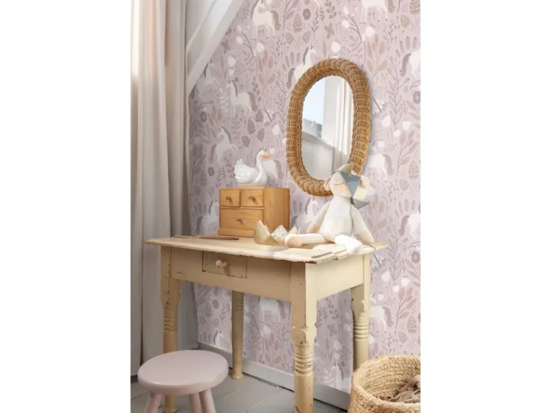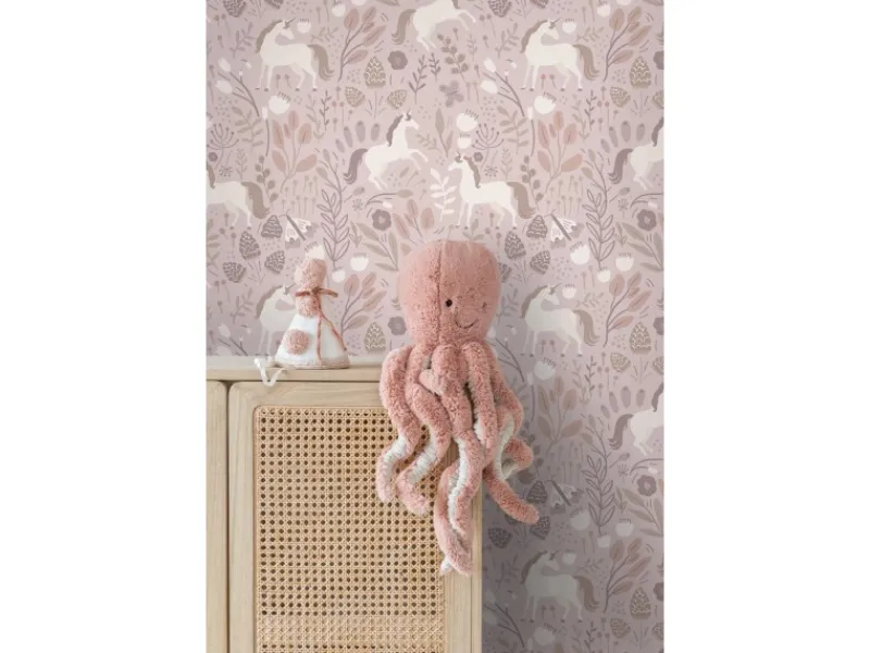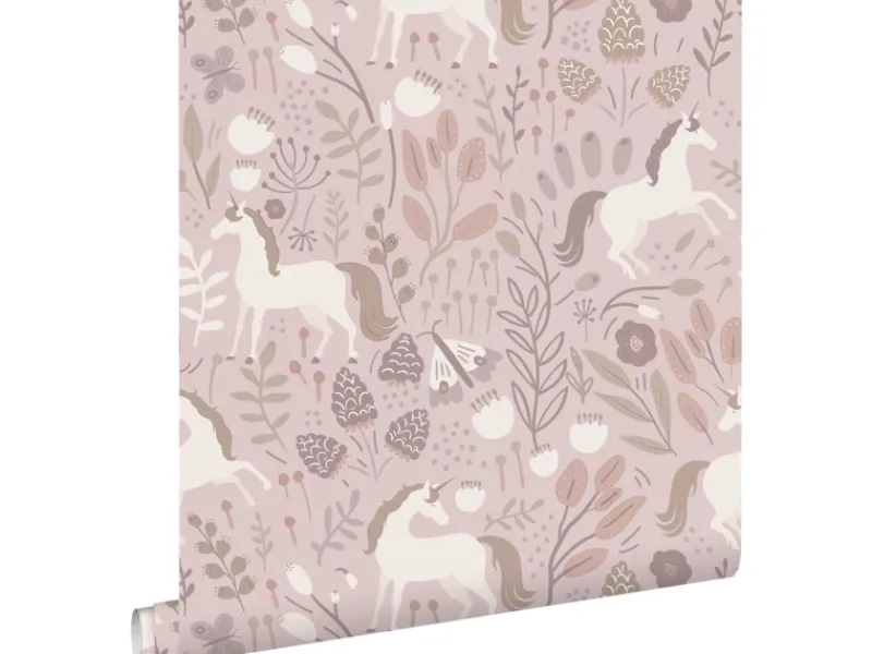 Diese niedliche Tapete mit Einhörnern in Mauve-Violett verwandelt jedes Kinderzimmer in ein magisches Abenteuerland. Kombiniert mit hellen Farben und natürlichen Materialien, entsteht eine angenehme und freundliche Atmosphäre, die zum Spielen, Träumen und Lachen einlädt.Maße, Rapport und Musterversatz Die Maße dieser Tapete sind 53 cm x 10. 05 m (Breite x Länge). Der Rapport ist 53 (gerader Ansatz). Das heißt, dass das Motiv sich alle 53 cm wiederholt und das Muster der einzelnen Tapetenbahnen auf gleicher Höhe geklebt werden muss.Tapezieren Das Anbringen dieser Vliestapete ist einfach und unkompliziert: nachdem der Vlies-Kleister direkt auf die Wand aufgebracht wurde, kann die Tapete angesetzt und anschließend glattgestrichen werden. Eventuelle Überstande können mit einem Cuttermesser entfernt werden. Beim Tapezieren wird kein Tapeziertisch benötigt und die Tapete ist auch nach Jahren restlos trocken abziehbar. Für das beste Tapezierergebnis empfiehlt ESTAhome den professionellen Wallpro PRO-301 Tapetenkleister. Vorbereitungstipp: Verhindere Probleme mit der Haftung deines Tapeten, indem du vorher testest, ob deine Wandoberfläche stark saugend ist. Nimm dazu einen feuchten Schwamm und befeuchte einen kleinen Teil der Wand. Wenn der feuchte Bereich innerhalb weniger Sekunden verschwindet, ist die Wand sehr saugfähig. In diesem Fall empfehlen wir, ein Grundiermittel zu verwenden, um die Saugfähigkeit zu verringern. ESTAhome empfiehlt hierfür die WALL PRO-401 Tapetenprimer.Sofort startklar! Am einfachsten ist es, direkt auch der benötigte Tapetenkleister und ein Wallpro PRO-933 Tapezierset zu bestellen. Dieses Tapezierset enthält alle Tapezierwerkzeuge, die beim Tapezieren von Vliestapeten benötigt werden. Diese Artikel können über das Suchfenster auf der Amazon Seite schnell gefunden und bestellt werden. So wird das Tapezieren zum Kinderspiel!