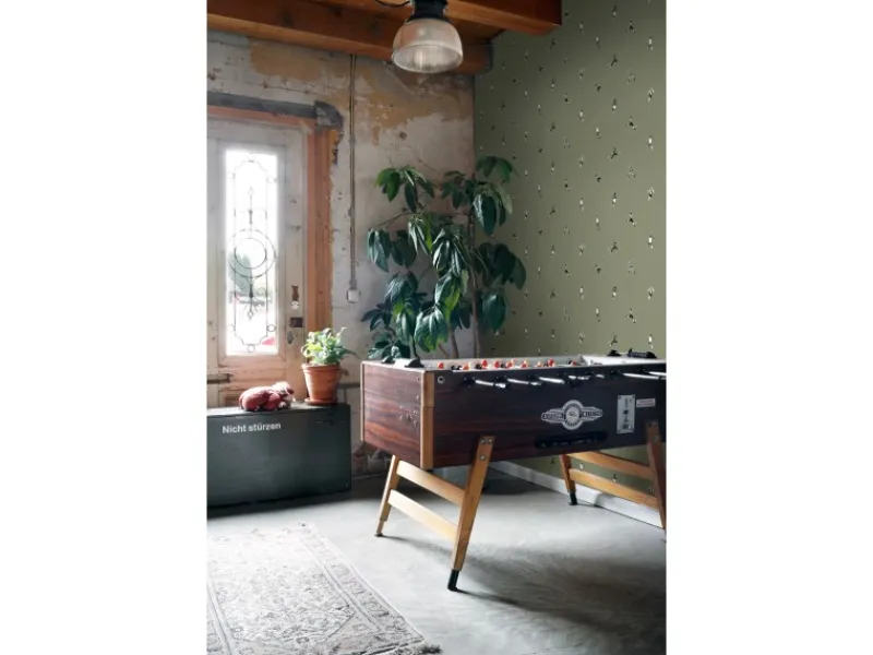 Diese fröhliche Tapete mit Fußballspielern in Olivgrün verwandelt jedes Kinderzimmer in ein wahres Abenteuerland. Kombiniert mit hellen Farben und natürlichen Materialien, entsteht eine angenehme und freundliche Atmosphäre, die zum Spielen, Toben und Lachen einlädt.Maße, Rapport und Musterversatz Die Maße dieser Tapete sind 50 x 900 cm (Breite x Länge). Der Rapport ist 50/25 (versetzter Ansatz). Das heißt, dass das Motiv sich alle 50 cm wiederholt und das Muster der nächsten Tapetenbahnen jeweils um 25 cm verschoben werden muss.Tapezieren Das Anbringen dieser Vliestapete ist einfach und unkompliziert: nachdem der Vlies-Kleister direkt auf die Wand aufgebracht wurde, kann die Tapete angesetzt und anschließend glattgestrichen werden. Eventuelle Überstande können mit einem Cuttermesser entfernt werden. Beim Tapezieren wird kein Tapeziertisch benötigt und die Tapete ist auch nach Jahren restlos trocken abziehbar. Für das beste Tapezierergebnis empfiehlt ESTAhome den professionellen Wallpro PRO-301 Tapetenkleister. Vorbereitungstipp: Verhindere Probleme mit der Haftung deines Tapeten, indem du vorher testest, ob deine Wandoberfläche stark saugend ist. Nimm dazu einen feuchten Schwamm und befeuchte einen kleinen Teil der Wand. Wenn der feuchte Bereich innerhalb weniger Sekunden verschwindet, ist die Wand sehr saugfähig. In diesem Fall empfehlen wir, ein Grundiermittel zu verwenden, um die Saugfähigkeit zu verringern. ESTAhome empfiehlt hierfür die WALL PRO-401 Tapetenprimer.Sofort startklar! Am einfachsten ist es, direkt auch der benötigte Tapetenkleister und ein Wallpro PRO-933 Tapezierset zu bestellen. Dieses Tapezierset enthält alle Tapezierwerkzeuge, die beim Tapezieren von Vliestapeten benötigt werden. Diese Artikel können über das Suchfenster auf der Amazon Seite schnell gefunden und bestellt werden. So wird das Tapezieren zum Kinderspiel!