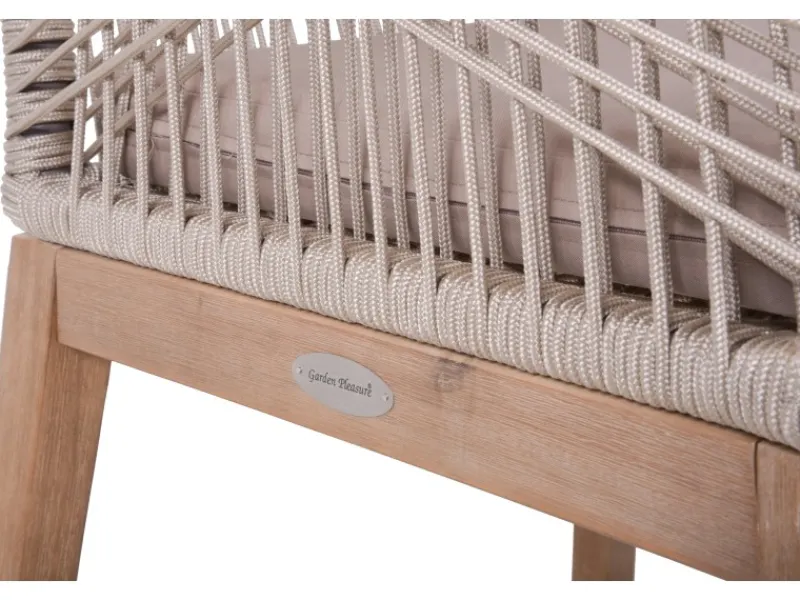 Die Sitzfläche ist mit einer robusten Seilbespannung versehen, die nicht nur komfortabel ist, sondern auch eine langlebige Konstruktion bietet. Die passende Polyester-Auflage in Braun sorgt für zusätzlichen Sitzkomfort und macht den Stuhl Pomona zu einer ansprechenden Ergänzung für Innen- und Außenbereiche.