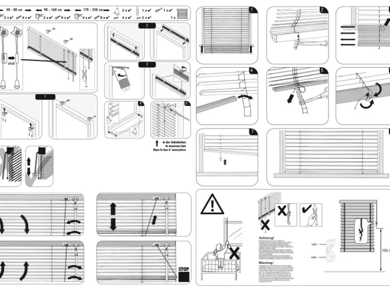 Das im Lieferumfang enthaltene Befestigungsmaterial ermöglicht Ihnen sowohl die Decken- als auch die Wandmontage. Alternativ können Sie die Jalousie mit dem passenden Klemmträger auch ohne Bohren und Schrauben montieren.