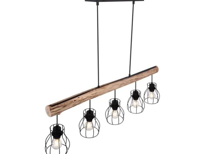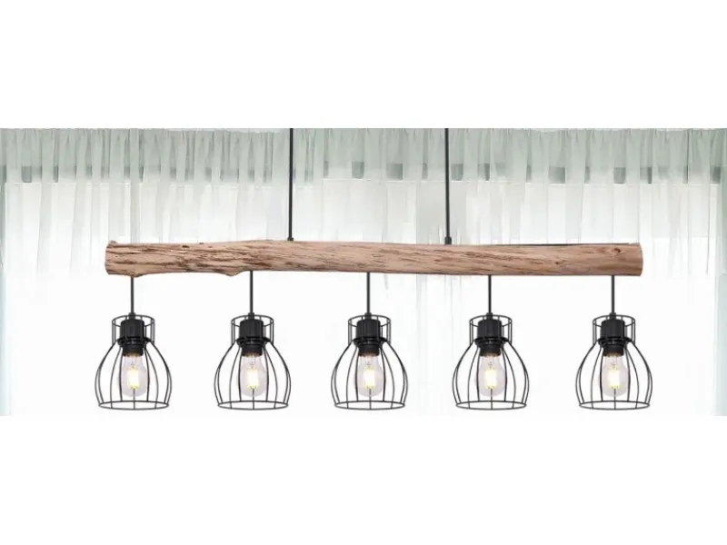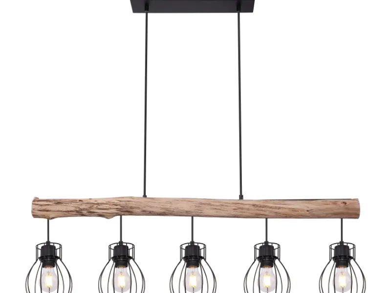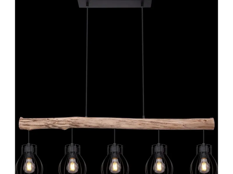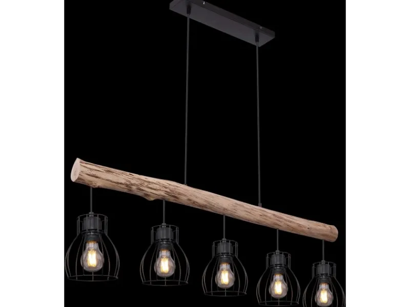 Die extravagante, stilvolle, Globo Hängeleuchte Mina aus schwarzem Metall, macht in nahezu jedem Raum eine gute Figur. An einen herabhängenden Holzbalken befinden sich fünf E27-Fassungen, welche von einem gitterförmigen, runden Lampenschirm umgeben werden. Durch die freie Wahl des Leuchtmittels (5 x E27 / max. 40 W) können Sie selbst über Lichtstärke und Lichtfarbe dieser Innenlampe bestimmen. Durch andere Modelle dieser Serie können Sie das Bild Ihres Wohnraumes weiter verschönern.