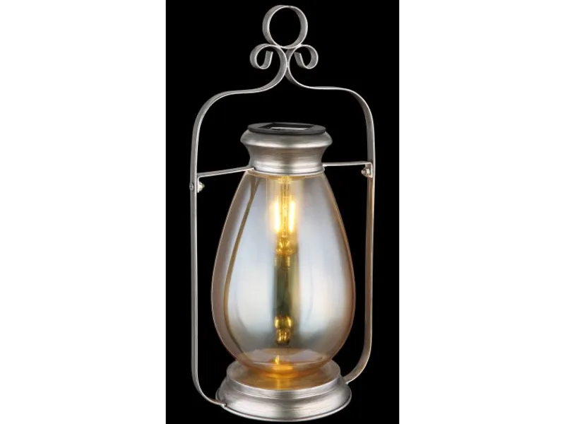 Der Schirm aus amberfarbenem Glas verleiht der Laterne ein gemütliches Ambiente und sorgt für eine angenehme Beleuchtung. Ob zum Hängen an einem Haken oder zum Stellen auf einem Tisch, die Laterne kann flexibel platziert werden und eignet sich sowohl für den Innen- als auch den Außenbereich.