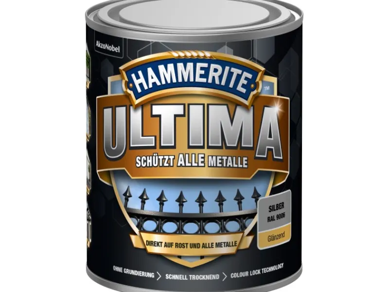 Die speziell entwickelte Rezeptur schützt jedes Metalle vor Rost, ist hochgradig witterungs- und UV-beständig. Hammerite Ultima schützt Gartenzaune, Treppen- und Balkongeländer, Garagentore, Fahrräder sowie viele weitere Metalle im Außenbereich. Erhältlich ist der Lack in 6 RAL-Farbtönen in Matt und Glänzend.