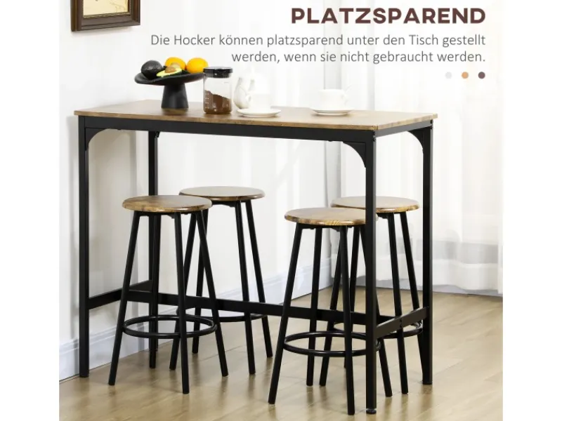 Verwandeln Sie einen kleinen Raum in ein einladendes Esszimmer mit diesem 5-teiligen HOMCOM Bartisch-Set im Industriedesign. Schaffen Sie einen gemütlichen Platz, um die täglichen Mahlzeiten mit Ihrer Familie oder Freunden zu teilen. Dieser lässig-industrielle Bartisch mit Hockern eignet sich gut für kompakte Räume, in denen zusätzliche Sitzgelegenheiten benötigt werden. Egal ob Sie essen, spielen oder Gäste empfangen wollen – dieses Bartisch-Set ist der ideale Ort für gesellige Zusammenkünfte.