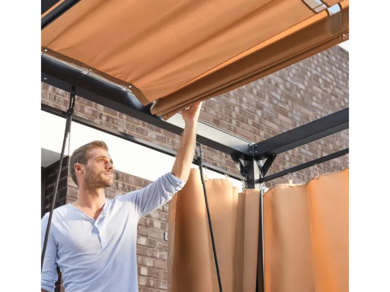 Das Faltdach können Sie bei Bedarf auf- oder zuziehen. So können sie je nach Wetter die Sonne genießen oder im Schatten verweilen. Die dicht gewebten Vorhänge sind aus 100 % Polyester und halten allzu grelles Sonnenlicht sowie Wind ab, damit Sie ungestört relaxen können. Die Seitenwände sind zudem wasserabweisend, sodass Sie bei einem kleinen Sommerregen nicht direkt ins Haus flüchten müssen. Der robuste Rahmen ist aus pulverbeschichtetem Stahl in Schwarz/Anthrazit gefertigt.