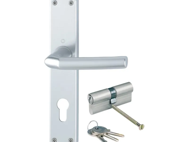 Die Hoppe Langschild-Türgriff-Garnitur Birmingham wird inklusive Profildoppelzylinder geliefert und ist passend für Türstärken von 57 – 62 mm. Die Türgriffe sind fest mit dem Schild verbunden. Sie sind drehbar gelagert und mit einem wartungsfreien Gleitlager ausgestattet. Die Befestigung erfolgt innen sichtbar mit Mehrzweckschrauben. Ein HOPPE-Profilstift verbindet die Griffe miteinander. Die Garnitur hat die Farbe Aluminium silberfarben.