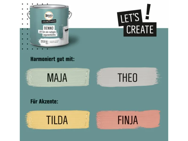 Die Innenfarben von CREATE! sind weder zu dünn noch zu zähflüssig. Sie haben eine geringe Spritzneigung und lassen sich so komfortabel verarbeiten. Und das ohne Konservierungs- und Lösemittel. Deine Lust auf einen neuen Look reicht.