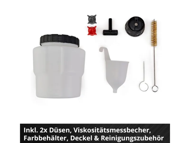Die Lieferung erfolgt inklusive 2 Düsen für unterschiedliche Lack- und Lasurviskositäten sowie 100 ml-Behälter zur Viskositätsprüfung. Zusätzlich enthält sie eine Reinigungsbürste zum Reinigen des Steigrohrs und eine Reinigungsnadel zum Säubern der Sprühdüse. Ein 800 ml-Farbbehälter mit Messskala und passendem Deckel ist ebenfalls enthalten.