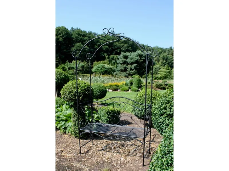 Der Rosenbogen ist nicht nur funktional, sondern auch ästhetisch ansprechend gestaltet. Spielerische Bögen aus Stahl zieren die aufwändig gestaltete Rückenlehne und die Seitenteile des Bogens, was ihm ein elegantes und dekoratives Aussehen verleiht.