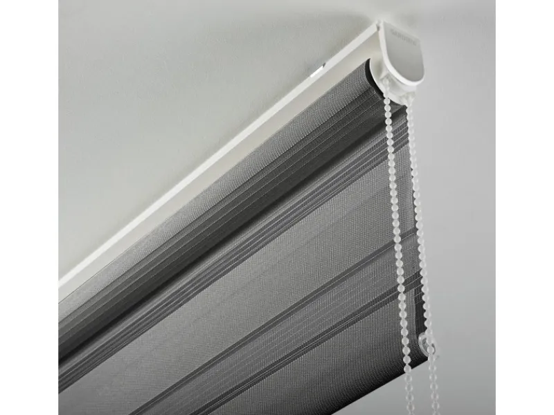 Der Stoff des Rollos ist abwechselnd in transparenten und blickdichten Streifen gewebt und verläuft doppelt gegeneinander, wodurch interessante Effekte entstehen. Die Sicht- und Lichteinfall können dadurch sehr genau dosiert werden. Das Seitenzuggetriebe zur Bedienung des Rollos lässt sich je nach Bedarf flexibel rechts oder links montieren.