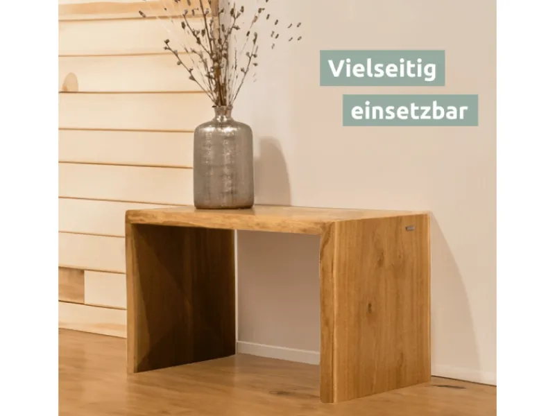Die sorgfältig ausgewählten Materialien für die Holzbank garantieren ein zeitloses und elegantes Design. Dank der natürlichen Optik passt die Massivholz Holzbank perfekt in Räume aller Art. Die Sitzbank ohne Rückenlehne ist daher eine ideales Möbelstück für Dein Zuhause.
