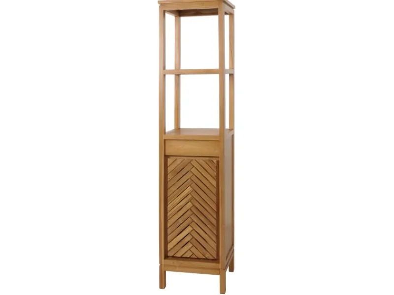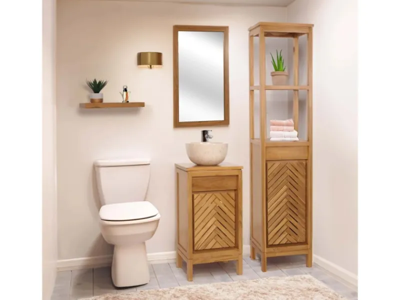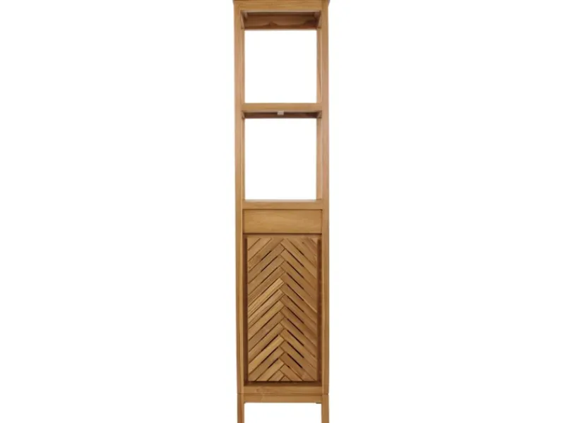 Entdecken Sie den idealen Aufbewahrungsort für Ihr Badezimmer – unseren Teakholz-Hochschrank in elegantem Design, der Funktionalität und Stil meisterhaft vereint. Dieses unverzichtbare Möbelstück wird ohne Dekoration geliefert, sodass Sie sofort mit der persönlichen Gestaltung beginnen können. Zwei großzügige Staufächer sind mit einer Tür und einem praktischen Einlegeboden ausgestattet, was Ihnen ermöglicht, Handtücher, Pflegeprodukte und weitere Badezimmerutensilien ordentlich und griffbereit zu verstauen.