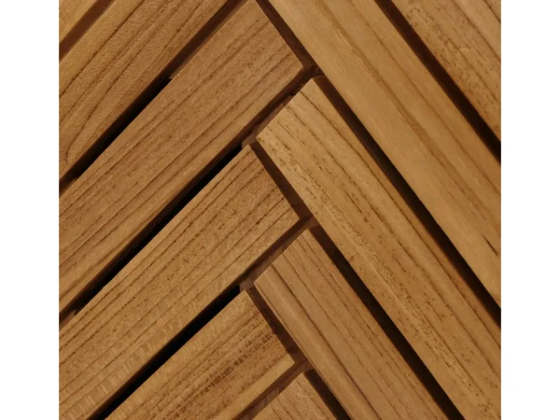 Die Tür bezaubert mit einem einzigartigen Fischgrätenmuster. Er ist nicht nur ein Blickfang für sich, sondern auch ideal kombinierbar mit weiteren Produkten unserer Teakholz-Serie.
