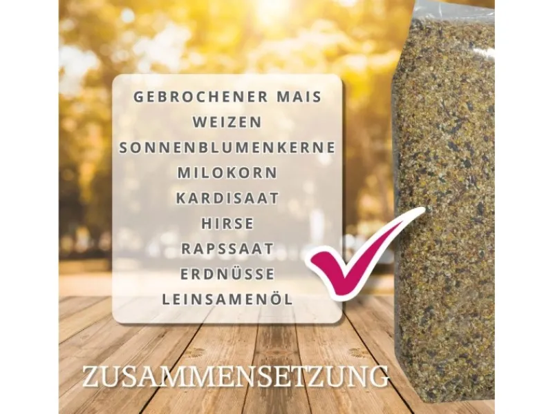 Mit: Mais, Sonnenblumenkerne, Weizen, Hirse, Milo, Rapssaat, Kardi, Erdnüsse und Leinsamenöl.