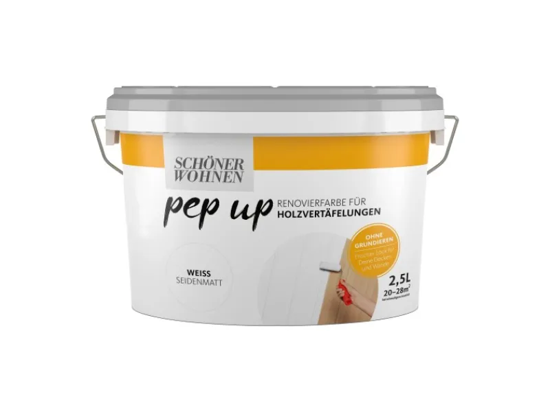 Mit den trendbewussten Schöner Wohnen pep up Renovierfarben für den Innenbereich entsteht schnell und einfach ein frischer Look für die eigenen vier Wände. Die Renovierfarbe für Holzvertäfelungen ist wasserbasiert, verfügt über eine sehr gute Kantenabdeckung, ist schnell trocknend und eignet sich für Holz, furnierte und bereits lackierte Vertäfelungen.