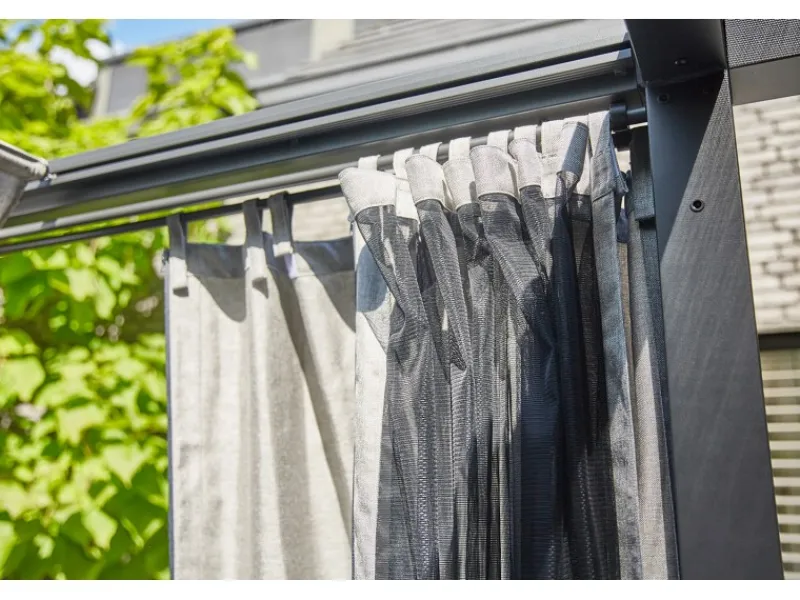 Die Siena Garden Seitenteile für die Schattenmanufaktur misst 300 cm x 210 cm und bestehen aus pulverbeschichtetem Stahl in der Farbe Anthrazit. Die Gardinenstange und der Vorhang sind zweigeteilt. Die Teile sind aus 100 % Polypropylen gefertigt und in der Farbe in Silber-Grau. Das Moskitonetz ist zweigeteilt und aus 100 % Polyester in Schwarz. Beides lässt sich mittig mit einem Reißverschluss verschließen.